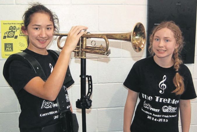 The FIRST LEGO League (FLL) Robotics team at Carrollton Junior High School has completed a remarkable project that will allow a fellow CJHS classmate, Abby Richards, who is challenged with blindness and upper body weakness, to pursue her dream of marching with the Carrollton High School Marching Band next year. The team, which is composed of Will Brown, Thomas Harris, Barak Kizunga, Reese Lawrence, Chase McDaniel, PJ Sanders, Thomas Svegl, Alice Szymkiewicz, Kendall Ussery, Mckenna Walker, and coaches Luke Young, Meredith Harris and Jason Svegl, was challenged with the mission to create a solution that would help someone learn. The result was “The BEAT” which stands for “Band for Everyone Accessibility Tool.”