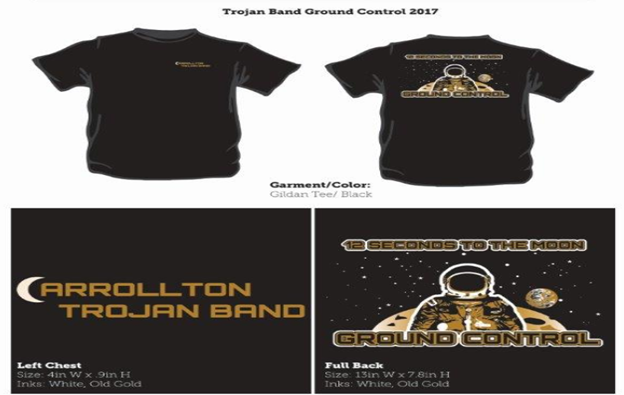 We are offering a complement design to the 2017 show shirt, but for a very limited time. This is a black tee option offered at a great price of just $10, great for a field help option. Orders are accepted till midnight Tuesday September 19th only! Pick up your order form at the band room display, or order online at: https://chstrojanband.revtrak.net/Spiritwear/#/v/2017-Ground-Control-T-shirt