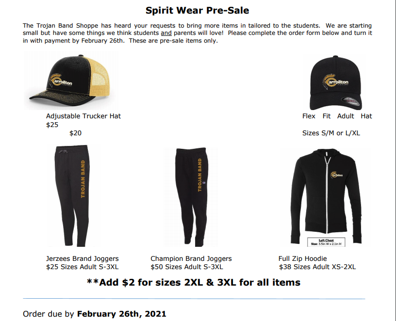 Forms for a special Band Shoppe order were sent home last week. Orders are due by February 26, 2021. You can download the order form here.