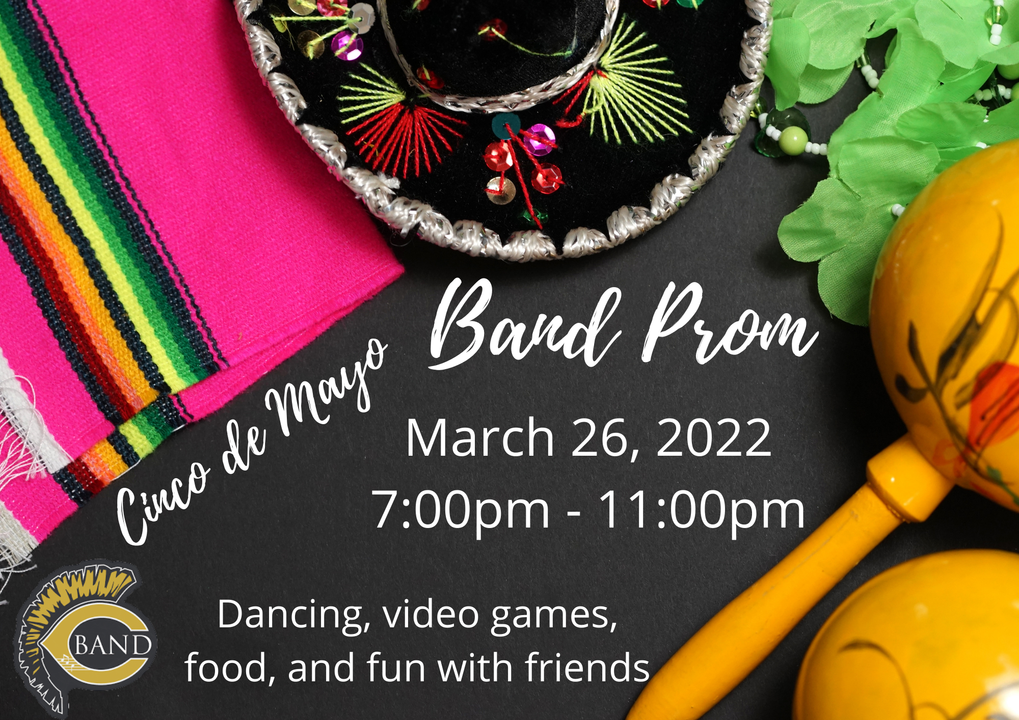 Because the Band BBQ is on May 5 this year, our Band Prom Theme is CINCO DE MAYO! All high school band (this always includes colorguard) students are invited to attend the band prom from 7:00PM – 11:00PM. This event has traditionally been called Band Prom, but it is more of a band party. There will be a DJ in the main band room for students to dance and have a great time, video games set up in the back room for students to hang out while gaming, and food in the lobby to keep the students energized and hydrated while dancing the night away.