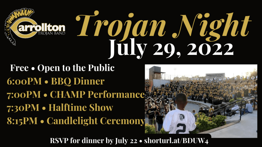 We will have our first public performance at Trojan Night on July 29, 2022. This is a free event and open to the public. The booster club is preparing a BBQ dinner for all who would like to attend. Please RSVP by July 22 so that we know how much food to prepare.