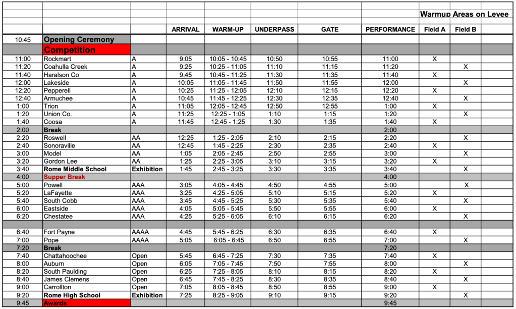 We compete at Barron Stadium in Rome on October 22, 2022. Above is the schedule of bands.
