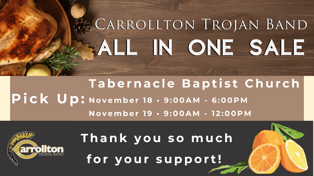 Please remind everyone who ordered from you that pick up for the All in One Sale is November 18 or 19 at Tabernacle Baptist Church. We will need volunteers to assist these days. Volunteer Here • 9:00AM – 5:00PM on November 18 and 9:00AM – 12:00PM on November 19.