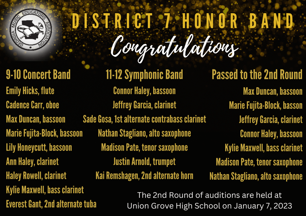 We had over 50 students who traveled to East Paulding High School extra early on Saturday to audition for District Honor Band! Each one of them has sacrificed many hours in preparation of this very competitive event. This year, the students auditioned early in preparation of the state championship game. We are extremely thankful for the efforts from and proud of all the students who auditioned this year! Congratulations to the students who were invited to participate: