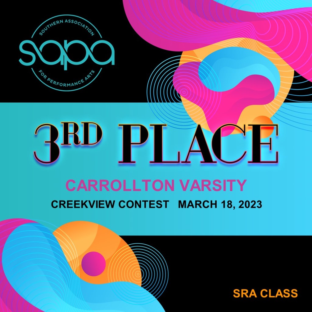 Saturday afternoon our Winterguards competed at Creekview HS in their final competition before SAPA Championships. The JV team finished 4th place in their division, and the Varsity team finished 3rd! The Varsity also received a promotion to a harder division because of the complexity of their show and their performance quality. Our JV team finishes their season at SAPA Champhionships on Saturday, April 1 in McKenzie Arena at the University of Tennessee Chattanooga and the Varsity performs their championship run on the following day on Sunday, April 2. Please come out to support our teams on March 30th for their friends and family show at 7:00PM in our CHS Gym.