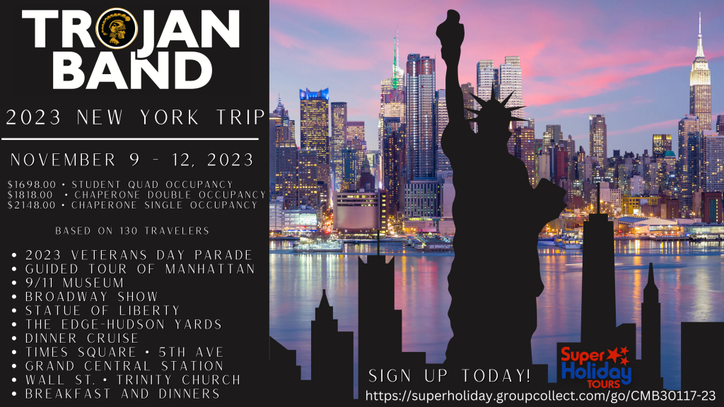 There are a few spots still available for the NY Trip. If your registration is pending, please begin making payments to be added to the trip. We especially need color guard students to add on to the trip if at all possible. Visit this website for more information about the trip.