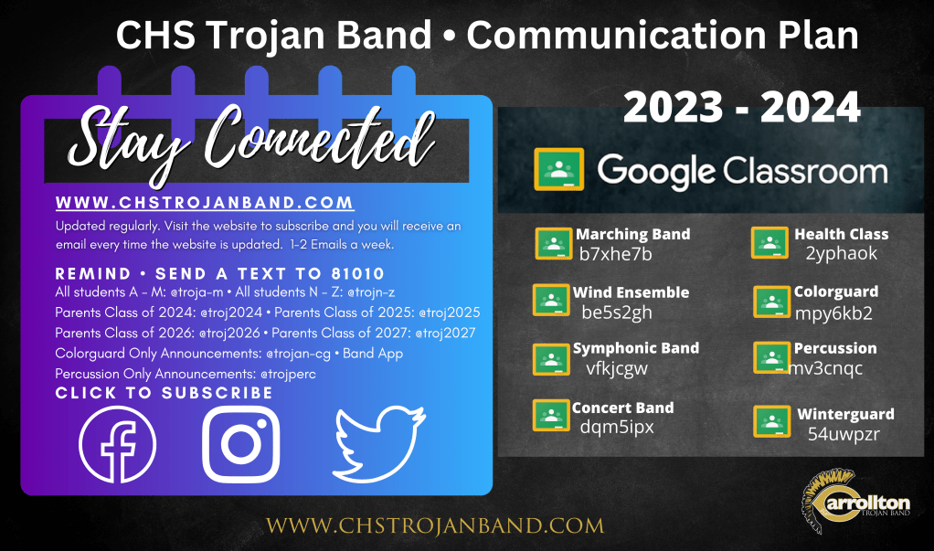 Please follow us on Facebook, Twitter, Instagram, and YouTube. We appreciate it when you share our stories to help us spread the good news about the great things that your children continue to achieve. To find us on these platforms you can follow the links at the top of the page on the right sidebar, or you can use our username: CHSTrojanBand.