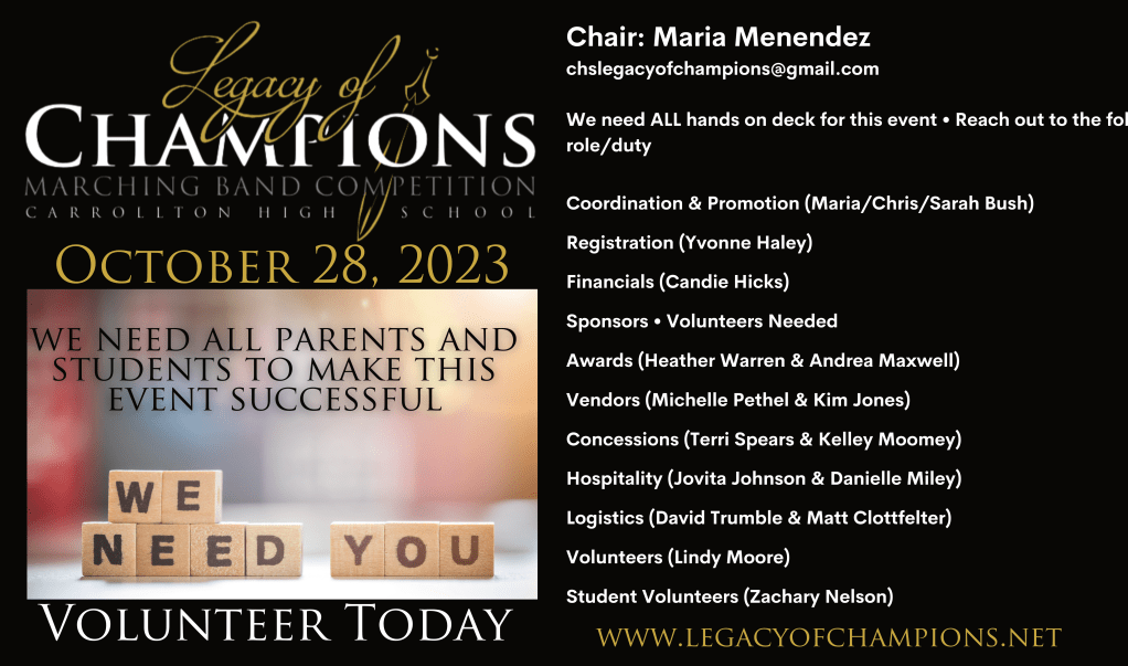 Please volunteer you can speak directly to the coordinator that you would prefer to work with, or you can email Lindy Moore at CHSTrojanBandVolunteers@gmail.com for assistance.