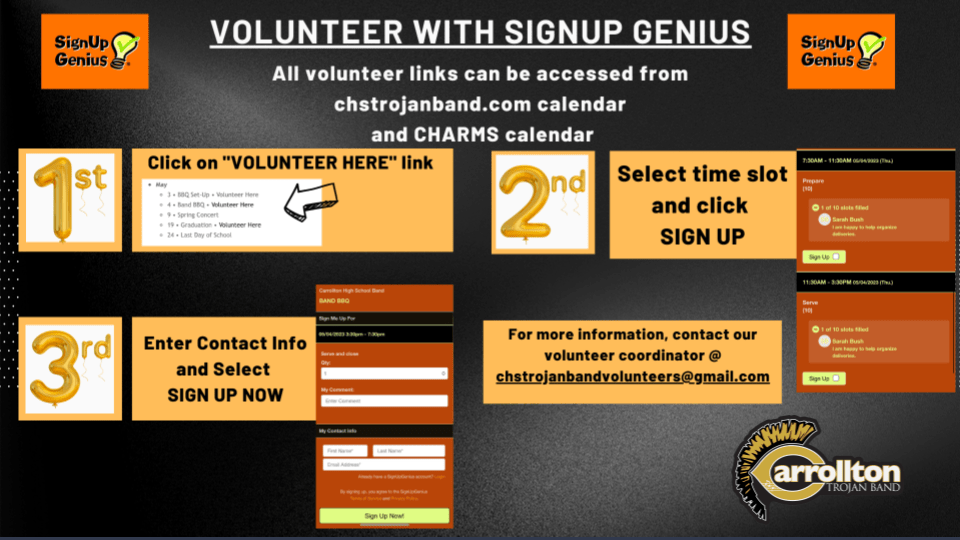 We use Sign-Up Genius to help communicate with needed volunteers. You can also email chstrojanbandvolunteers@gmail.com if you have any questions or need help with Sign-Up Genius.