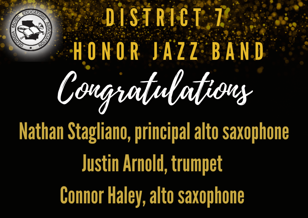 Special congratulations to Nathan Stagliano, Justin Arnold, and Connor Haley for earning membership into this year’s District Honor Jazz Band. They will participate in Ringgold, GA at Heritage HS on November 13th and 14th.