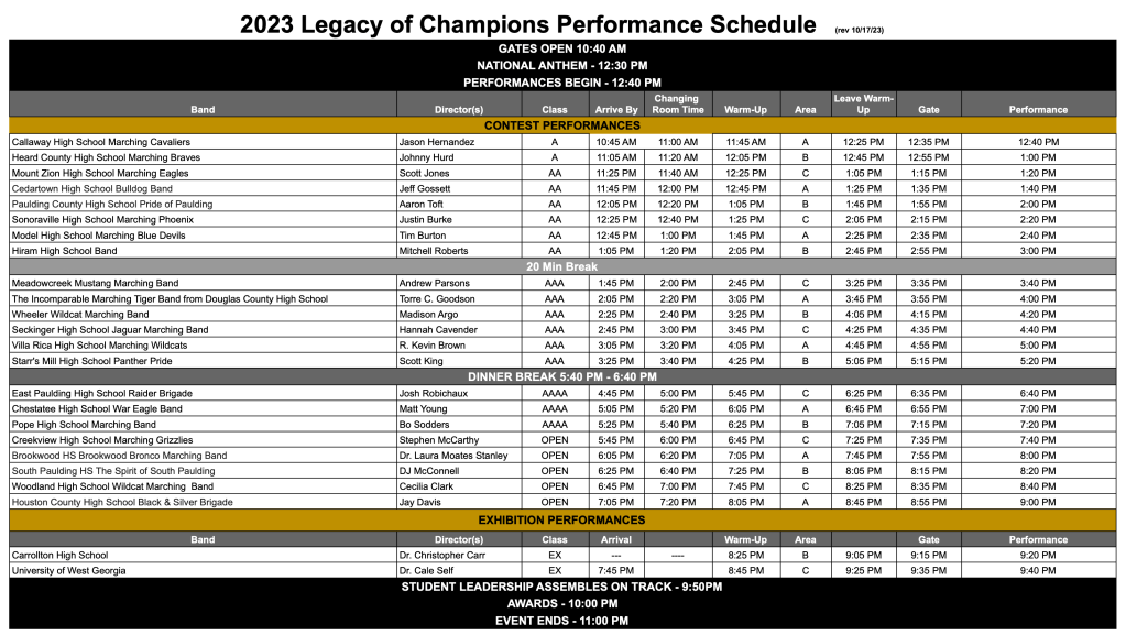 - Saturday: Legacy of Champions Marching Competition • Volunteer Here