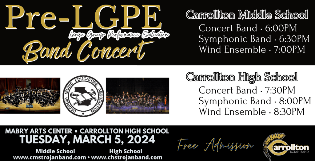 Our 5K is quickly approaching and is scheduled for March 16, 2024. Band students participate as volunteers and perform for our runners throughout the course. Please visit https://runsignup.com/race/events/ga/carrollton/trojanband5k to register today. Aren’t a runner? You can walk, or you can just sign up to support your Trojan Band and get the T-shirt. You can also support us by sharing this opportunity on your social media as often as possible. Thank you so much for supporting our band students!