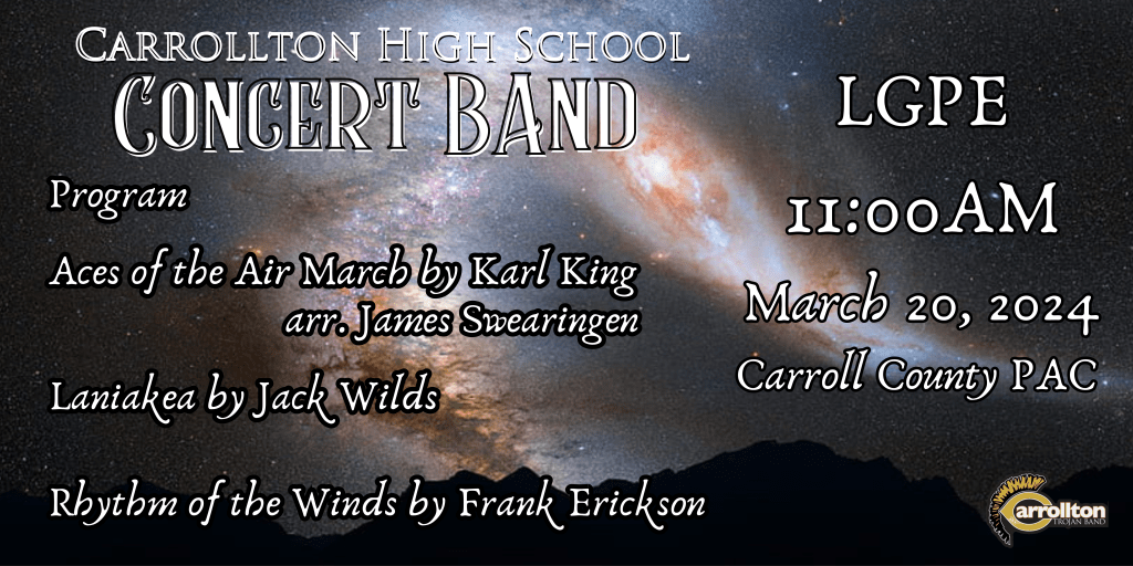 All 3 of our bands perform on Wednesday, March 20 at the Carroll County Schools Performing Arts Center • 775 Old Newnan Rd, Carrollton, GA 30116. Concert Band performs at 11:00AM, Symphonic Band performs at 3:10PM, and Wind Ensemble performs at 8:00PM. The performances are free and open to the public. The students have worked incredibly hard during their preparations for this concert. Seeing you in the audience makes it all worth it. Thank you for making arrangements to attend their performances.