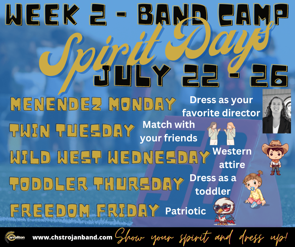 The section leaders have designated the following spirit days for band camp. We encourage our students to participate in the spirit days to increase relationship building and create memories together during this important week of our season.
