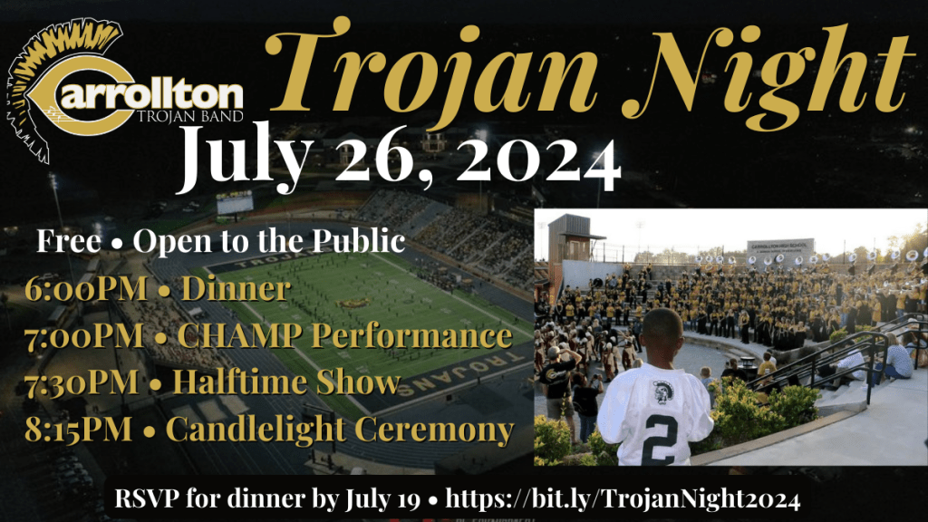 We will have our first public performance at Trojan Night on July 26, 2024. This is a free event and open to the public. The booster club is preparing dinner for all who would like to attend. Please RSVP by July 19 so that we know how much food to prepare.