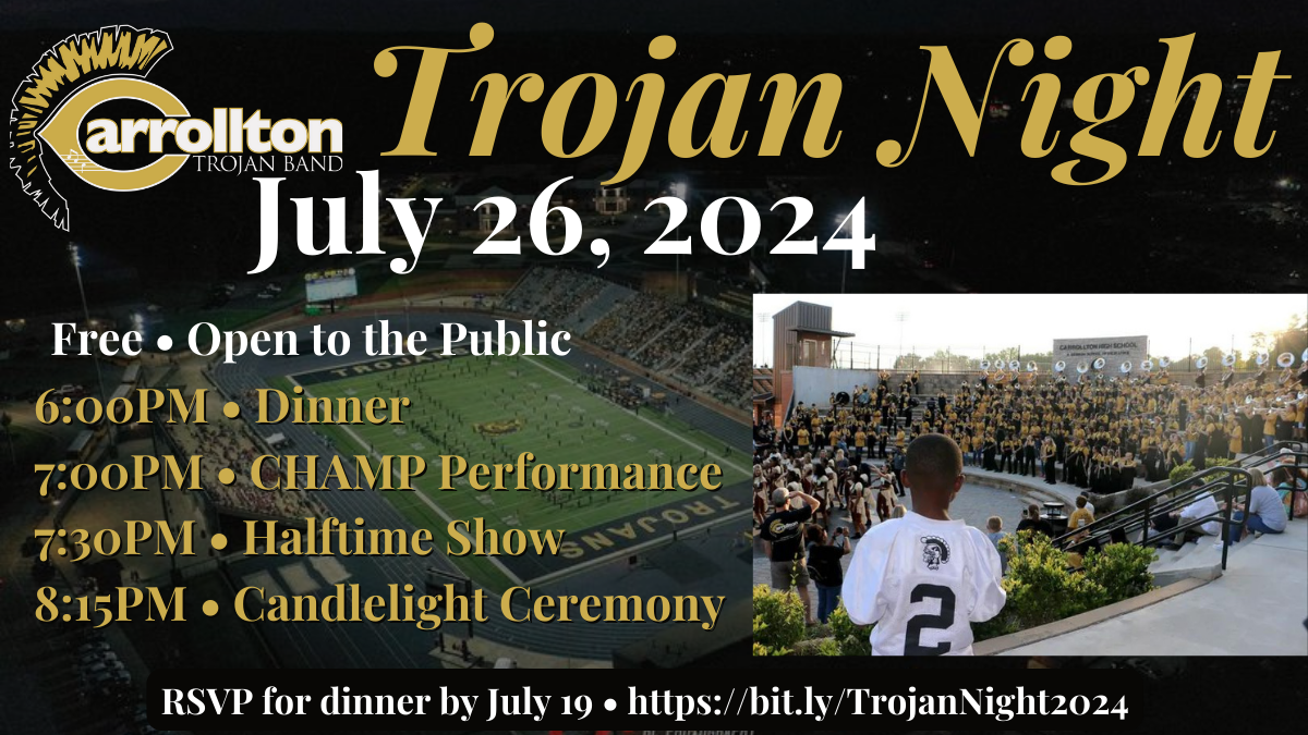 Our Carrollton Trojan Band had 2 outstanding weeks of band camp to prepare for the 2024 season. The students’ talents continue to impress, the staff continues to raise the bar, and our parents continue to provide critical support. Sparks of Imagination debuted on Friday night at our annual Trojan Night celebration to a large audience of friends, family, community, and alumni! It was the perfect way to celebrate the start of another successful season! Be sure to catch your Trojan Band at all home and away football games! Here is the video from Trojan Night celebrating the week.