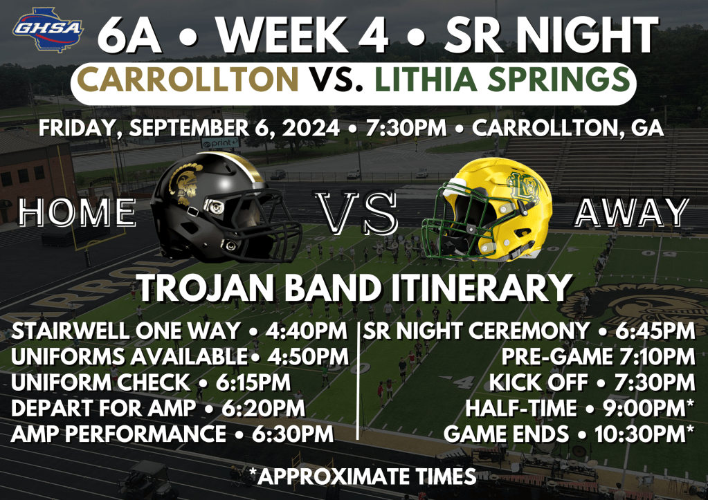 Congratulations on another outstanding week! We learned the drill and performed part 3 of the show this week, then prepared a wonderful ceremony for SSG William Rivers. Unfortunately the weather had other plans. Mrs. Rivers was in great spirits and mentioned that her husband was a bit of a prankster. She said that he made it rain on the day he was honored at the Veteran’s Memorial Park as well. We are going to try again this Friday, stay tuned for updates. This week we see Lithia Springs and honor our seniors for Senior Night. Their ceremony is also pregame, we are working on logistics of the 2 ceremonies and will communicate more details as they become available. Seniors, please see Dr. Carr before reporting to the cafeteria for your photos to get your cord for your uniform. Your pregame ceremony starts at 6:55PM, we will exit the AMP with plenty of time for you to make it back to your parents for your ceremony. When you are finished there will be time for you to join us for the National Anthem.