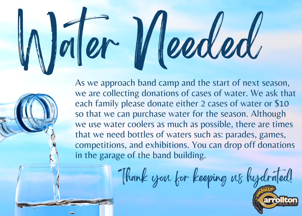 Thank you to everyone who has already brought in water! We are still collecting water and can accept donations any day next week. Thank you so much for your help in keeping our students hydrated!