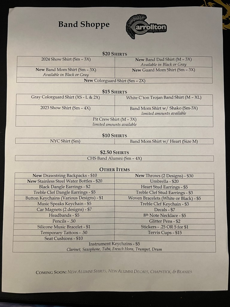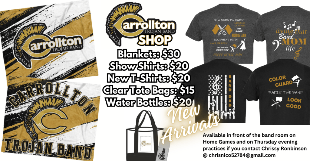 Chrissy Robinson is working hard to bring great new merch options to our band fans. She will have the following items available on Friday nights in front of the band room for home games as well as Thursday night rehearsals between 7:30pm – 8:30pm. If you need something on Thursday, please email her at chrisnico52784@gmail.com so that she can make sure to have it out for you.