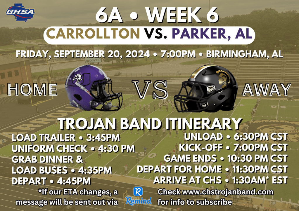We travel to Birmingham, Alabama for the game against Parker HS on Friday. We will be grabbing dinner on the way to the bus and Mrs. Malmquist is sending us extra food because we know the students will be hungry on the way home too! Thank you to Simply Catering for sponsoring our pre-game meal and to the CHS Nutrition Team for sponsoring our post game meal! We are very blessed to have strong support for our students.