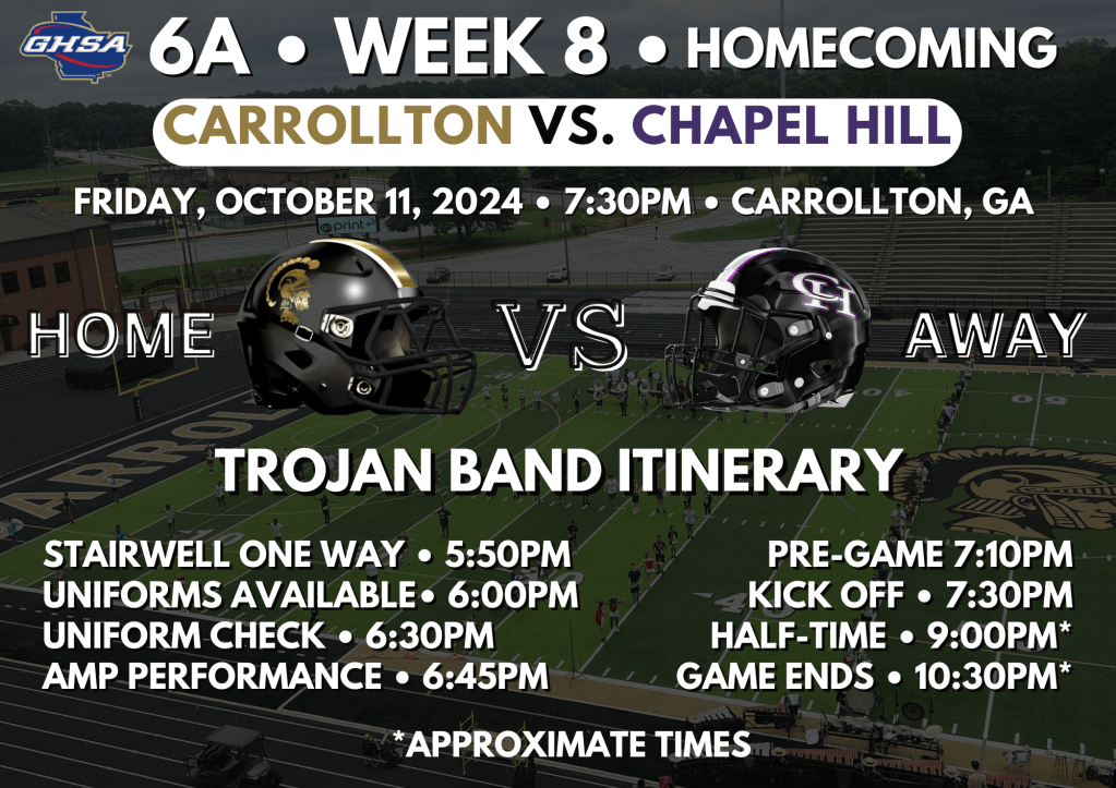 Last week was another REMARKABLE week for our Trojan Band. We performed the Carroll County Marching Exhibition where we watched and cheered on the bands from throughout the county. It was so much fun to perform for a very appreciative audience including band family members, band students, Dr. Albertus, Mr. Lyle, and Coach King! On Friday, we hosted 78 8th graders for the game against West Lake. Thank you so much to Ms. Delores Hudson, Mr. Montrell McClendon, Coach Scott Morris, and Mr. Richard Hytower for assisting us in picking them up in the Charter Buses to bring them over to the high school. Our student leadership created handwritten invitations and prepared goodie bags for them as well.