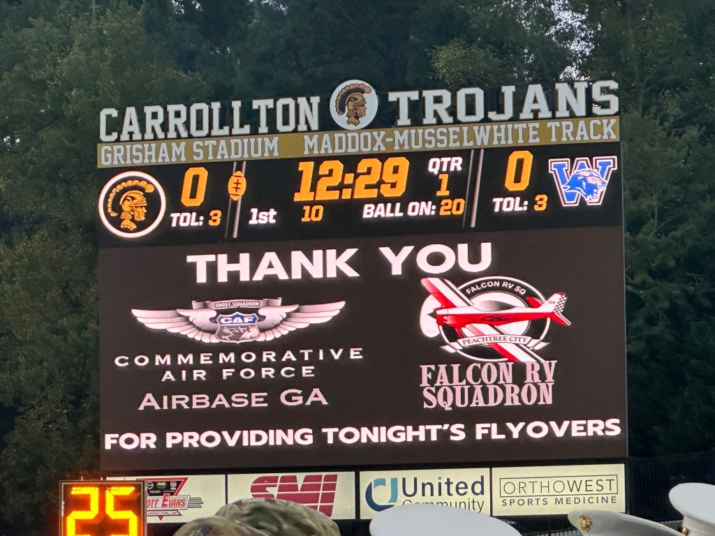 At the game the weather finally cooperated to allow us to host the ceremony to honor SSG William Rivers. Thank you to Mrs. Darlene Rivers, William Rivers, and family for allowing us to honor their family. We appreciate Mr. Lyle, Col. Mike Farr, and the numerous Veteran’s who attended to support the ceremony. Thank you to Derek Warren for coordinating the attending veterans. Additionally, thank you to Rob and Yvonne Haley, and Bob Walden for coordinating the special flyover for the ceremony. We greatly appreciate the efforts by the Commemorative Air Force Airbase GA and The Falcon RV Squadron to coordinate, plan, and execute the flyover. This was a ceremony that we had to reschedule multiple times due to weather and we are very appreciative of the flexibility and determination by all involved to provide this ceremony for the Rivers family and our community. It was a beautiful tribute to honor the American heroes lost on January 28. The game was a close game for the first half and then our Trojans continued to persevere to an overwhelming 63-27 victory over Westlake.