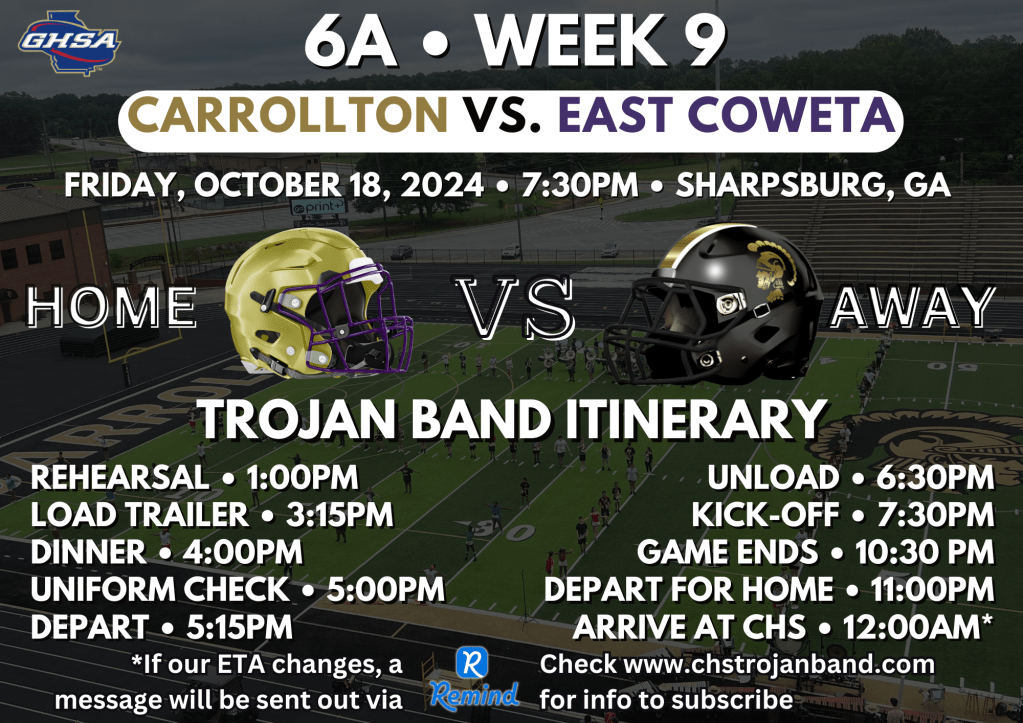 Fantastic job all week last week! Our Trojan Band showed out for the dress up days, began their Friday with a performance for the magnet distribution, continued with an energetic pep rally that included a hilarious race by faculty members wearing inflatable costumes, then marched down Ben Scott Blvd joined by our 8th graders so that we could form 2 marching bands and greet all of Carrollton City Schools (especially the elementary students!), performed 2 pep rallies at local nursing homes, welcomed alumni back for a reception in front of the band room, performed in the AMP, pre-game, in the stands, the homecoming ceremony, and still gave an electric performance after the game! We even had some of our students perform the show in the homecoming dresses! The Trojan Band continues to amaze us with their determination and professionalism! Thank you so much to the parents who continue to pour into our children and the staff who work tirelessly to get them ready. Now, let’s take a break before things speed back up when we get back.