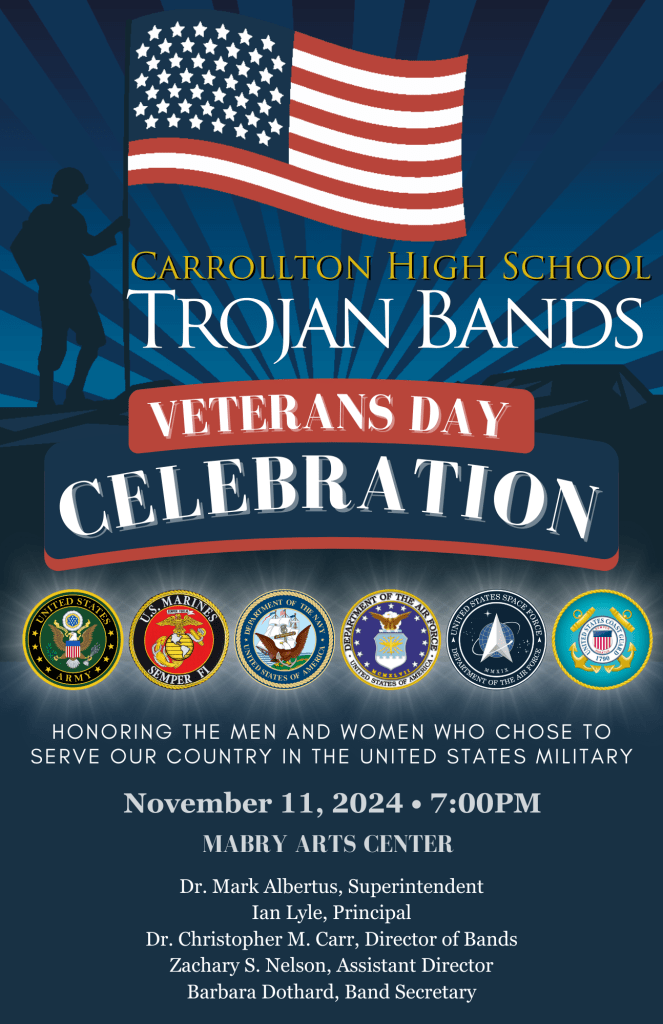 The Wind Ensemble students will perform for the school Veteran’s Day assemblies organized for our JROTC program. Students should wear all black attire for the event. Concert attire is acceptable as well.