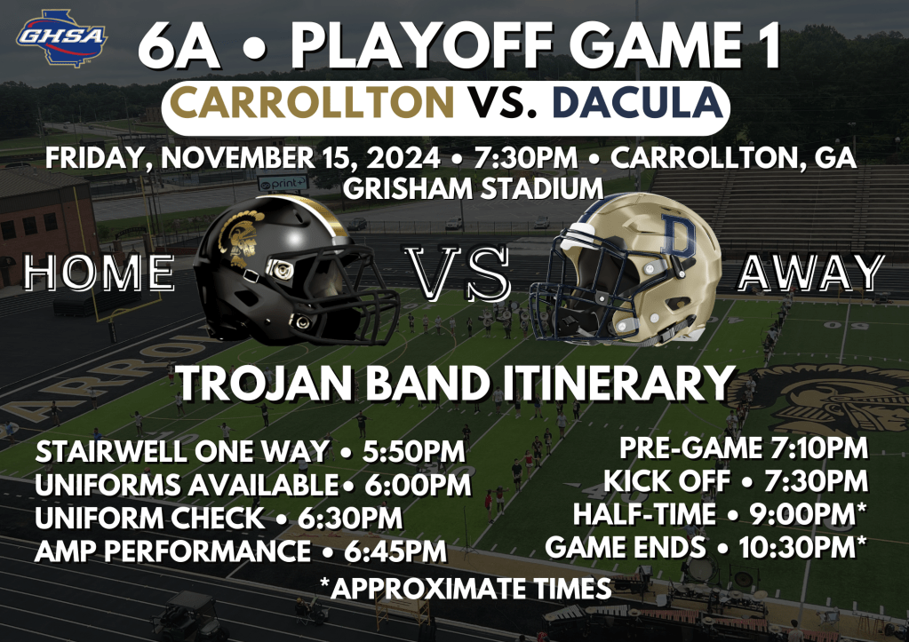 We hope that everyone enjoyed the student holiday last Friday and will return to school tomorrow rested and well. This week we have our Veteran’s Day assembly, Veteran’s Day Concert, Winter Guard Tryouts, a fine arts college fair on Wednesday, and our 1st playoff game on Friday at home vs. Dacula HS. When we win this game, then we will have another home game next week.