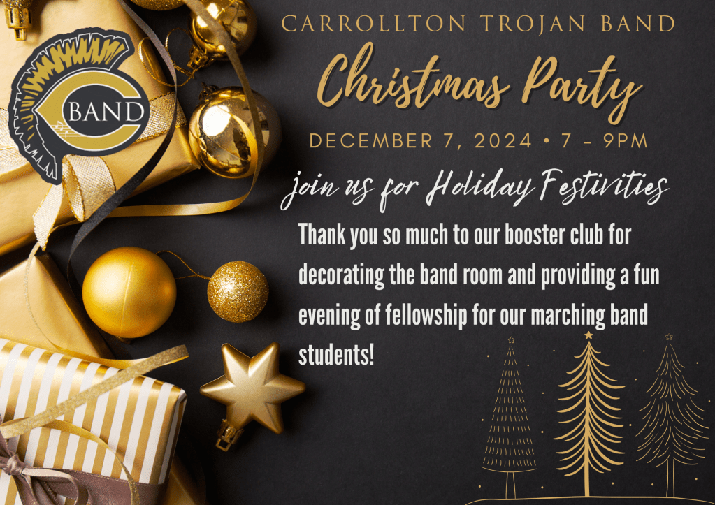 Our Trojans were victorious again on Friday (46 – 6 over Hillgrove), leading us to the Semi-Final game this Friday. We unfortunately did not win the coin toss, so we are traveling to Buford this Friday. On Saturday we will perform on annual Carrollton Christmas parade through Adamson Square followed by our annual band Christmas party! It’s going to be another great week! Go Trojans!