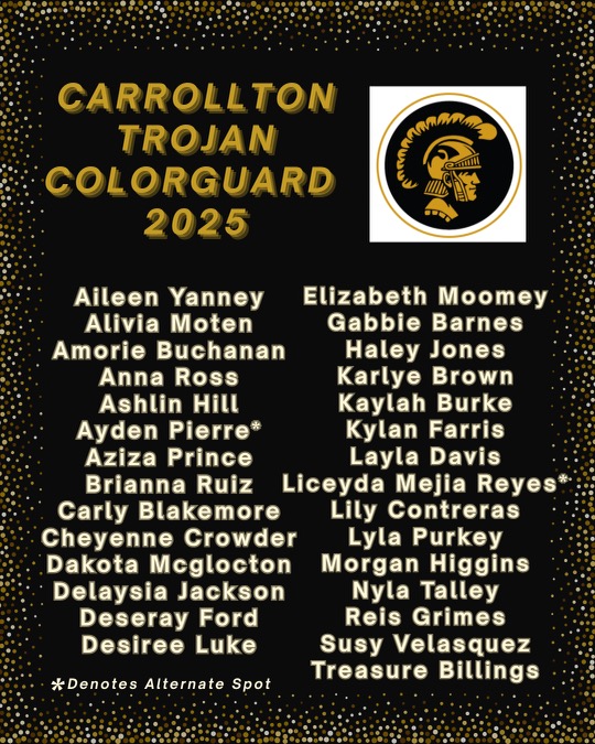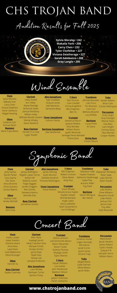 Congratulations to all of the students who auditioned! We look forward to working together next year to create some spectacular performances for our community and make incredible memories together! The band placement results are based on who has auditioned. If you missed your audition, please contact Dr. Carr at christopher.carr@carrolltoncityschools.net or Mr. Nelson at zachary.nelson@carrolltoncityschools.net ASAP to set up a time. It is not too late, and we would LOVE to add you to our team!