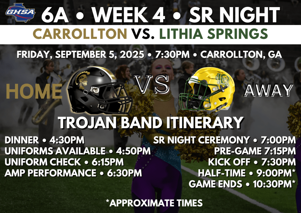 Halftime was outstanding! The Rome crowd enjoyed the show and provided very loud ovations throughout our show. This Friday we plan on adding the first half of the 4th movement for the first time. It is senior night too so we a few celebrations for our seniors. 1) Senior Breakfast – parents decorate a Trojan Head and leave a basket of goodies for your senior after Thursday’s practice (9:00PM) and bring a breakfast item to share on Friday morning (7:30AM). Seniors meet early to enjoy breakfast before 1st block (7:45AM). Seniors see Mr. Nelson or Dr. Carr by 5:00PM to get their cord, and then report for photos in the Cafeteria by 5:20PM. After photos you can report back to the band room to perform in the AMP with the band. You’ll join your parents on the track when we get back for the ceremony. When the ceremony is finished, you’ll rejoin the band for the National Anthem. After the game, we march back into the band room for a fun evening of stand tunes to celebrate our seniors!