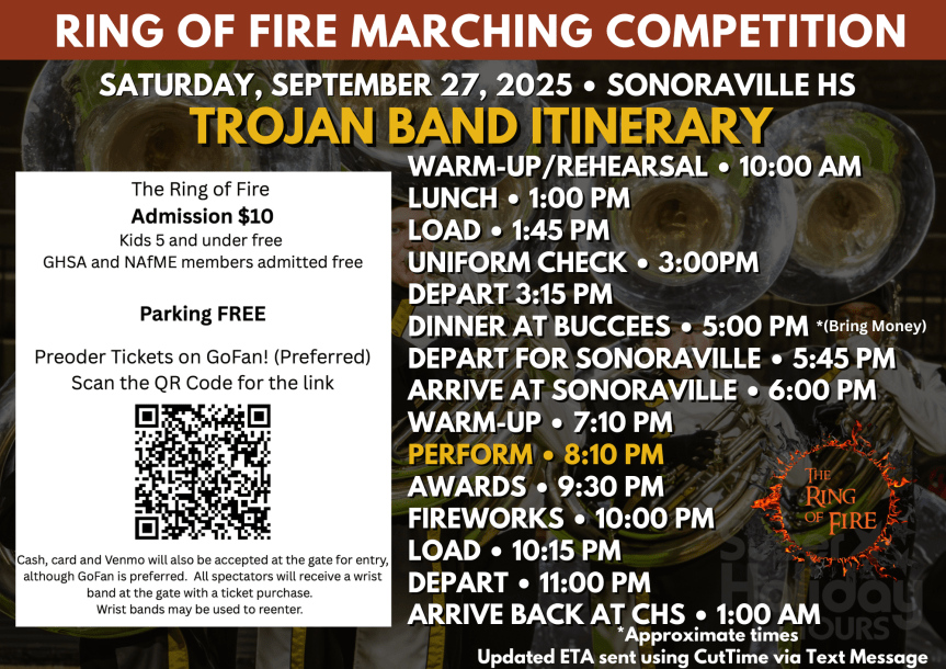- Saturday: Ring of Fire Marching Competition at Sonoraville High School • Volunteer Here • Buy Tickets
