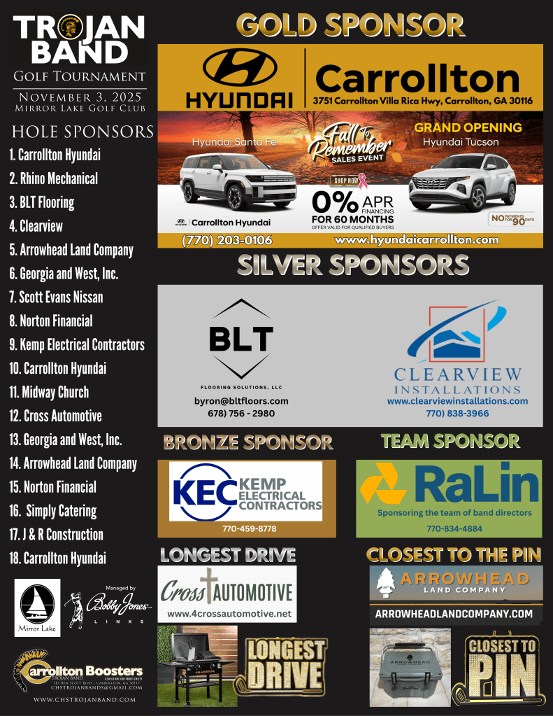 Hyundai Carrollton, our Gold Sponsor for the golf tournament, brought vehicles to display on the course and hung out with us all day. Silver Sponsors, BLT Flooring and Clearview Installation, each had a team in the tournament. Kemp Electric, our Bronze Sponsor, also had a team play in the tournament. Special thank you to Cross Automotive for sponsoring the Longest Drive with a Black Stone Grill and spending the day with us at the hole! And to Arrowhead Land Company for sponsoring the Closest to the Pin with an Arctic Cooler. Thank you to RaLin for sponsoring a team, which allowed Dr. Carr and Mr. Nelson to play along with a few band alumni. Money raised during the tournament will be used to send our Winterguard to the annual SAPA Championships.