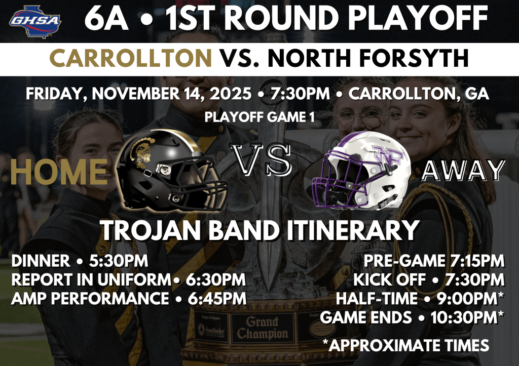 - Friday: Playoffs Round 1 • HOME vs. North Forsyth | Armed Forces Salute and Battle Hymn