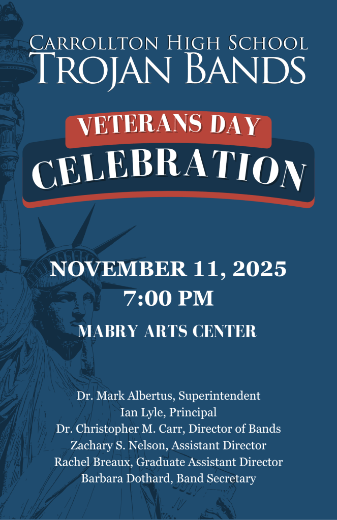 The Carrollton High School JROTC Program hosts annual Veterans Day assebmlies for all Carrollton City Schools students. The assembies start at 8:30AM and continue throughout the day. During the ceremonies, local Veterans are honored, the JROTC drill teams perform exhibition, and the music programs of each school are featured. Our Wind Ensemble performs for the ceremony at 10:00AM and again for the ceremony at 2:20PM. All other students will attend with their grade level