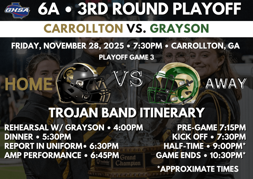 We had another very productive week. Our Trojans are now 12-0 as we head into Thanksgiving Break, and we host Grayson on Friday at home! Grayson is currently ranked #1 in the nation by USA Today, and we are ranked #11. Last year we had a heartbreaking loss to Grayson in the championship game. We need everyone in the stands on Friday night, cheering on our team. It’s going to be an exciting game!