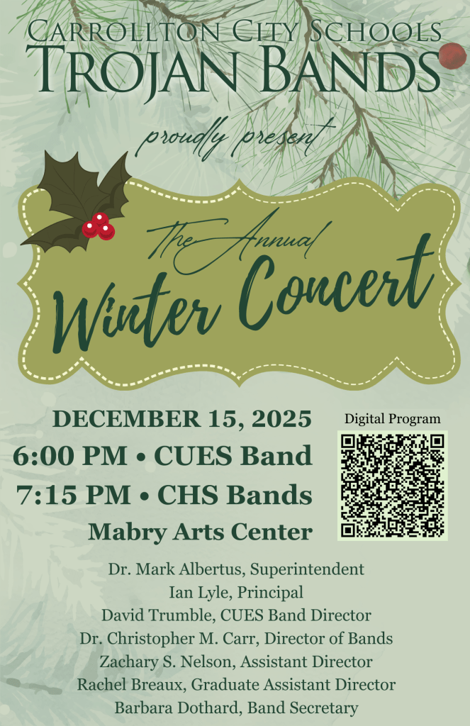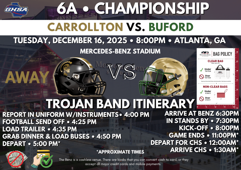 This week, we have our Christmas Concert on Monday evening and will be traveling to cheer on our football team in the State Championship at Mercedes-Benz Stadium on Tuesday! It is an exciting week for us, and we look forward to doing our part to bring home that championship! Thursday and Friday are final exams at CHS. 3rd and 4th block finals are Thursday, and 1st and 2nd block finals are on Friday. Additionally, Friday is a 12:30PM Early Release to start our Christmas Vacation.