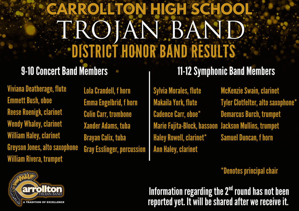 Congratulations to the following Honorable Mentions: Flute Quartet: Sylvia Morales, Carry Chen, Makaila York, Viviana Deatherage; Sebastian Valle on piano, Lucas Priest on euphonium; Trojan Trebles Trio- Addington Adair, Abigail McCoy, and Molly Wallis; Marie Fujita-Block on bassoon; and Haley Rowell on clarinet. Also to the following performers who placed: 5th Place Gray Esslinger on marimba; 4th Place Scout Jones from Central; 3rd Place the Olympus Saxophone Quartet – Tyler Clotfelter, soprano sax, Greyson Jones, alto sax, Camren Harley, tenor sax, and Yael Ramirez, bari sax; 2nd Place Edwin Wright from Bremen, and the Trojan Sound Quartet in 1st place: Caden Clifton, Abel Akin, Damien Ruiz-Schelp, and Landen Jordan. All of our students represented us extremely well! Congraulations to all!