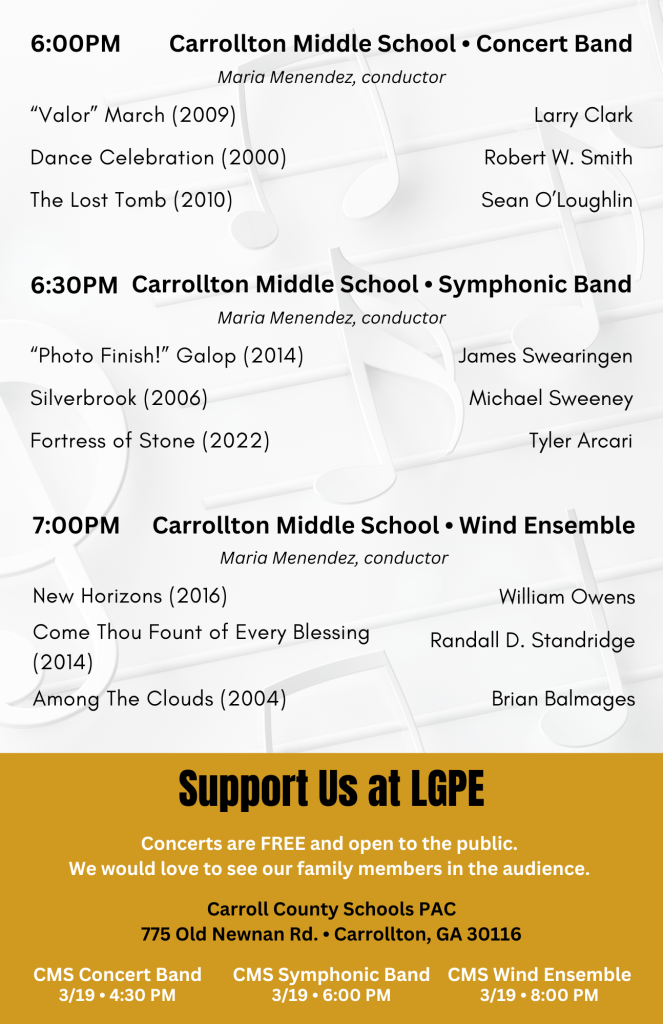 Our PreLGPE concert is next week. All 3 of our Middle School and High School bands will perform for a panel of judges to help us prepare for the official performances later in March. We will be joined by Dr. Joshua Boyd from Point University, Dr. Trey English from Feagin Mill Middle School, and Dr. Matt Koperniak from Fulton County Schools making comments for us that evening. We will be wearing our formal concert attire for this event. Students are welcome to watch each others concerts, but we ask that they report to Mr. Cox’s room at the appropriate time for attendance.