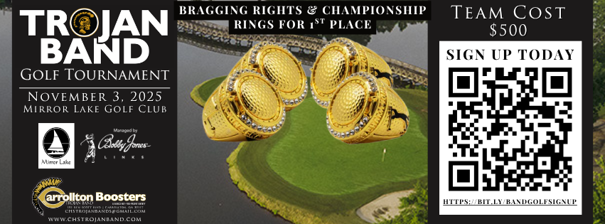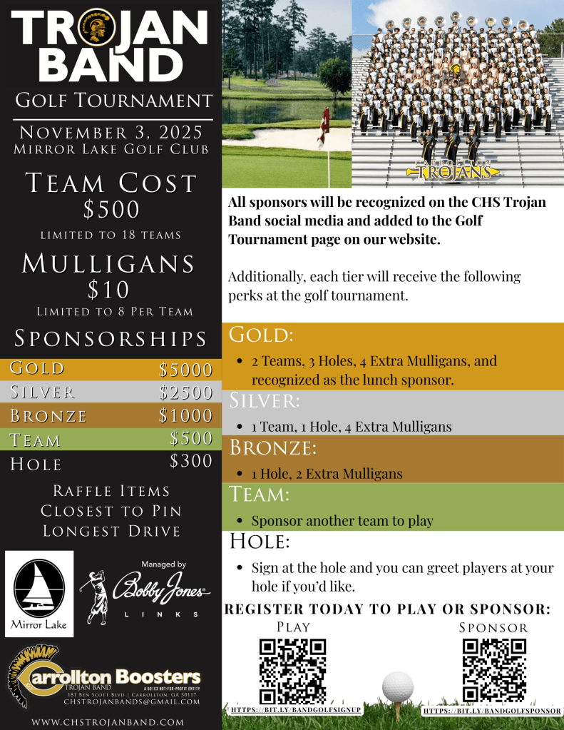 Golf Tournament Nov 3, 2025 • Mirror Lake • chstrojanbands@gmail.com | 770) 834-0550 2025 Golf Tournament Sponsors How to Become A Sponsor Trojan Band Golf Tournament by Trojan Band Boosters Share this: Click to share on Facebook (Opens in new window) Facebook Click to share on X (Opens in new window) X Click to email a link to a friend (Opens in new window) Email Click to print (Opens in new window) Print Like Loading...