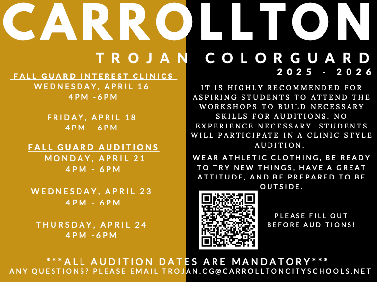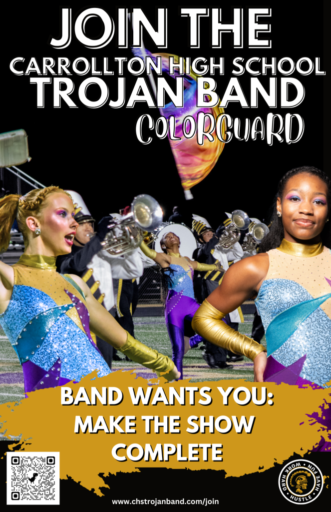 Thank you for your interest in participating in the Carrollton High School Trojan Band! Currently, we have three band classes throughout the day for winds and percussion, and a class 4th block for colorguard students. All classes meet together after school to create the Trojan Marching Band. Auditions are required to determine class placement, and all members are eligible to participate in the marching band. Our marching band performs for all home and away football games, pep rallies, parades, exhibitions, and competitions.